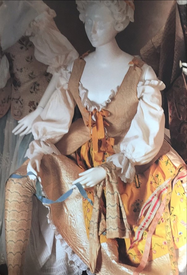 Caraco (pet-en-I ‘air) of pink striped silk taffeta, comperes, braid trimming, sobot cuffs with bouilonne(French, C.1775) ,petticoat of green silk taffeta appliqued with embroidered chinoiserie flowers, birds and insects (English C1720), shoes of linen with crewel work, high heels.